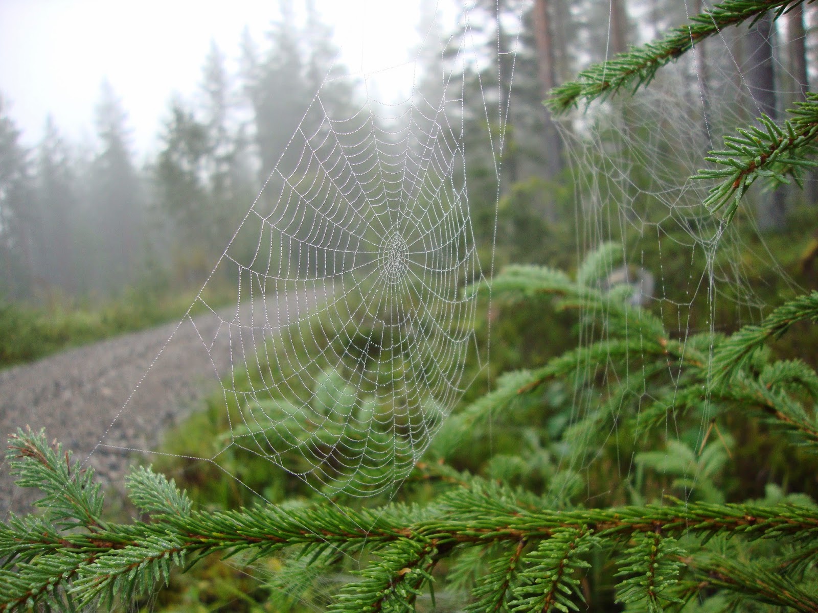 Tänä aaumuna oli jälleen sumuista. Koululaisten mennessä taksille, ihmettelimme taas kerran metsässä näkyvien hämähäkinverkkojen määrää! Tälläisellä säällä ne tulevat erittäin hyvin esiin, kun sumu tiivistyy niihin. On suorastaan hätkähdyttävää millaisessa seittimetsässä sitä oikein elellään ja kuljetaan. Useimmiten ne  seitit eivät vain näy, mutta ovat silti olemassa. Joskus tiellä kävellessäkin huomaa jonkun seittilangan käyvän kasvoihin. Ja pihassa oli hämähäkki vetänyt seittilangan koivusta aika korkealta alas maahan.